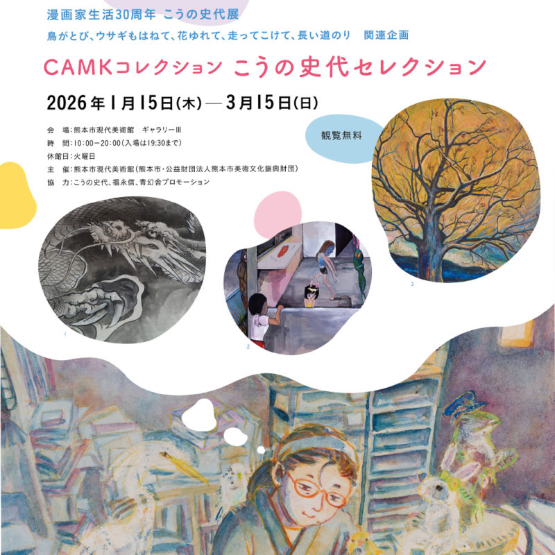 『夕凪の街 桜の国』(手塚治虫文化賞新生賞、文化庁メディア芸術祭マンガ部門大賞)、『この世界の片隅に』(文化庁メディア芸術祭マンガ部門優秀賞)等で知られる漫画家・こうの史代の全貌に迫る初の大規模原画展です。デビュー前のイラストから最新作まで、500枚以上の漫画原画と下書きやメモなど多数の貴重な資料群を通して、漫画家生活30周年の道のりをたどります。当館は、開館当初より漫画を現代アートのひとつとして扱ってきました。また熊本県は近年「マンガ県くまもと」を掲げています。漫画の専門学科を設けている大学や高校もでき、漫画への注目度が高まっています。本展では、そんな「マンガ県」ならではのイベントの数々と、膨大な原画展示によって、多彩なこうの芸術の魅力を紹介します。こうの史代にはアシスタントがいません。一人で描いているからこそ、その原画には「一枚の絵」としての魅力があります。一貫した愛らしいタッチと、一作ごとに異なる挑戦に溢れています。紙の上にどこまでも広がる、漫画表現の可能性をお楽しみください。