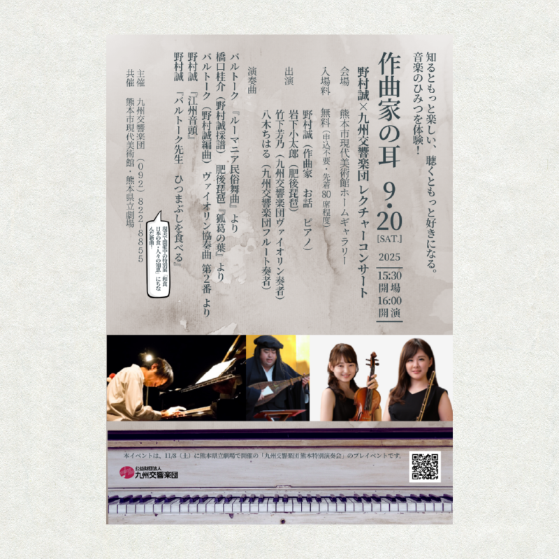 九州交響楽団 熊本特別演奏会プレイベント 作曲家の耳バルトークとストラヴィンスキー ~野村誠×九州交響楽団 レクチャーコンサート~ 2025.07.12 2025年 , 地域連携 , お知らせ , 【イベント】すべて , 【その他情報】 九州交響楽団 熊本特別演奏会プレイベント 作曲家の耳 バルトークとストラヴィンスキー ~野村誠×九州交響楽団 レクチャーコンサート~ 11月に熊本県立劇場で開催される九州交響楽団コンサートのプレイベント。 今回は、作曲家でピアニストの野村誠さんをゲストに迎え、熊本に伝わる語り芸である肥後琵琶と共演しながら、自身の作品にロシアやハンガリー、ルーマニアの民謡を組み入れたストラヴィンスキーやバルトークの魅力に迫ります。 日 時 2025年9月20日(土) 16:00~17:30 場 所 熊本市現代美術館ホームギャラリー 参加費 無料