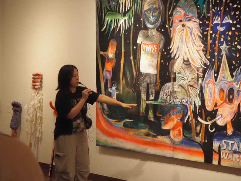 展示室に入って正面の作品《 we are on the fire 私たちは最高》は、しまうちさんが南九州に引っ越し、来訪神の取材やリサーチを経て制作された作品です。悪石島のボゼや神楽のお面、 映画に登場する生き物やしまうちさんが想像するキャラクター、南国を連想させる樹木などが入り混じって描かれています。「宮崎に来て、南国の植物や景色が鮮やかに映った」と語り、「作品はどのように描き進めていくのですか?」という会場からの質問には、「将棋を指すような感覚」としまうちさん。「ここが決まったら次はここを、動く部分があれば動かして、詰みになったらお終いというイメージ」と話されました。