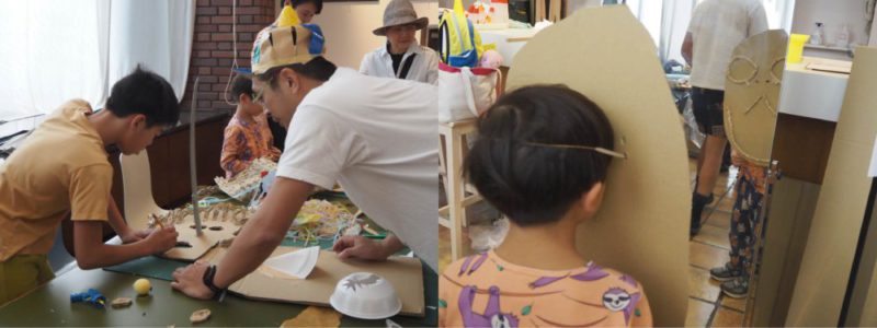 アートラボマーケットに戻り、まずは段ボールをベースに自分の考える来訪神の形を決めていきます。