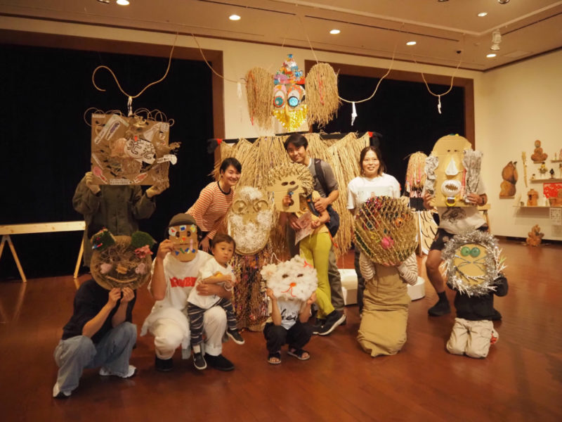時折 鏡の前で来訪神の姿をチェックしながら、パーツの大きさや飾り付けなど、試行錯誤を重ねていきます。参加者の皆さんは夢中になりながらも、無事それぞれの来訪神が完成しました。最後は集合して展示室のひゃ~たれと共に記念撮影。たくさんのユニークな来訪神が誕生しました!
