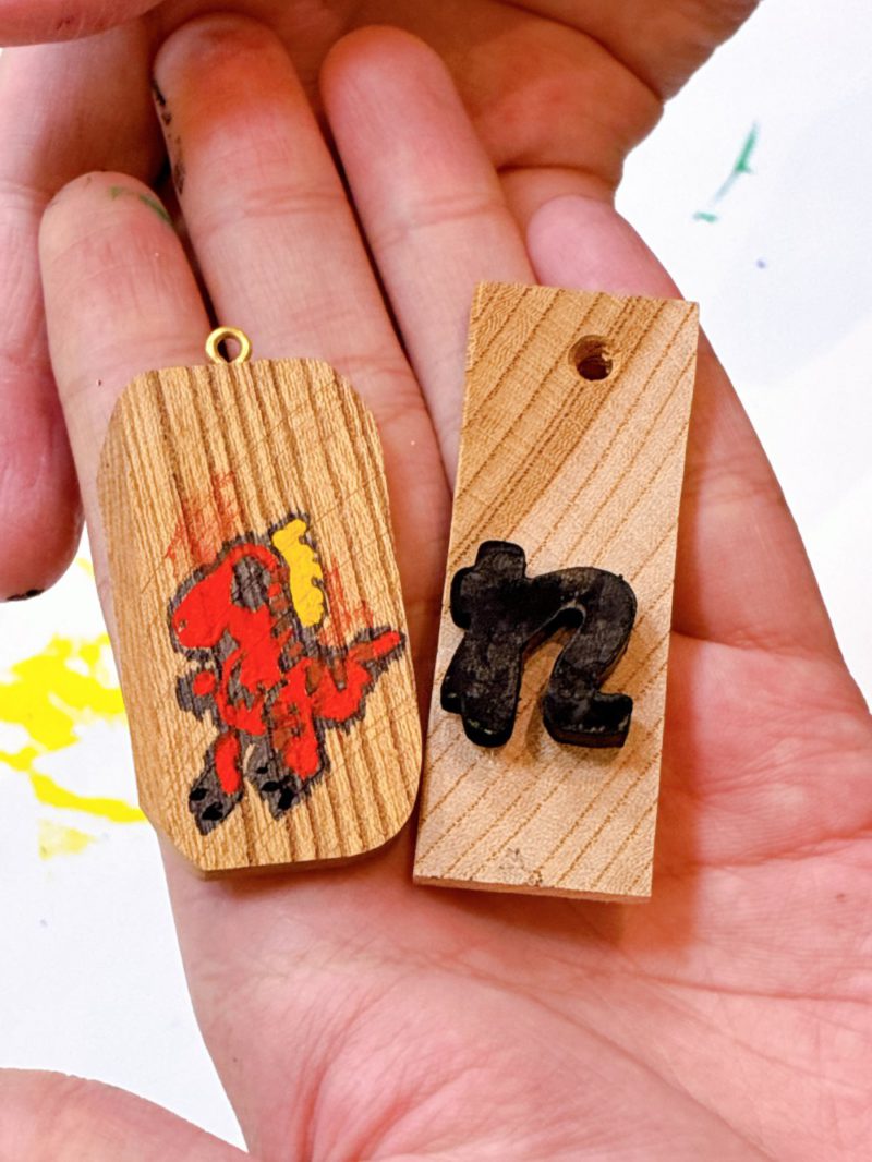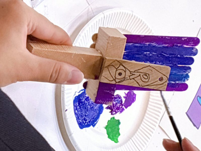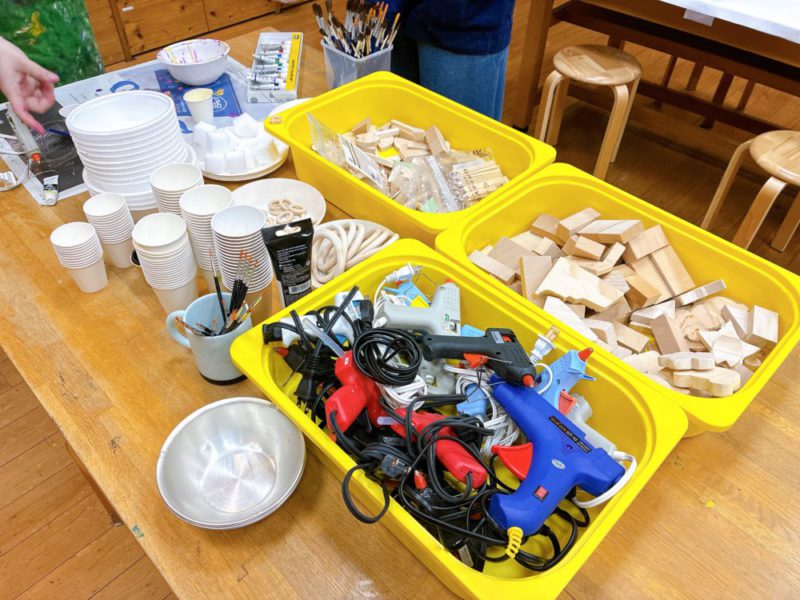 主な材料は、木材、ホットボンド、アクリル絵の具です。