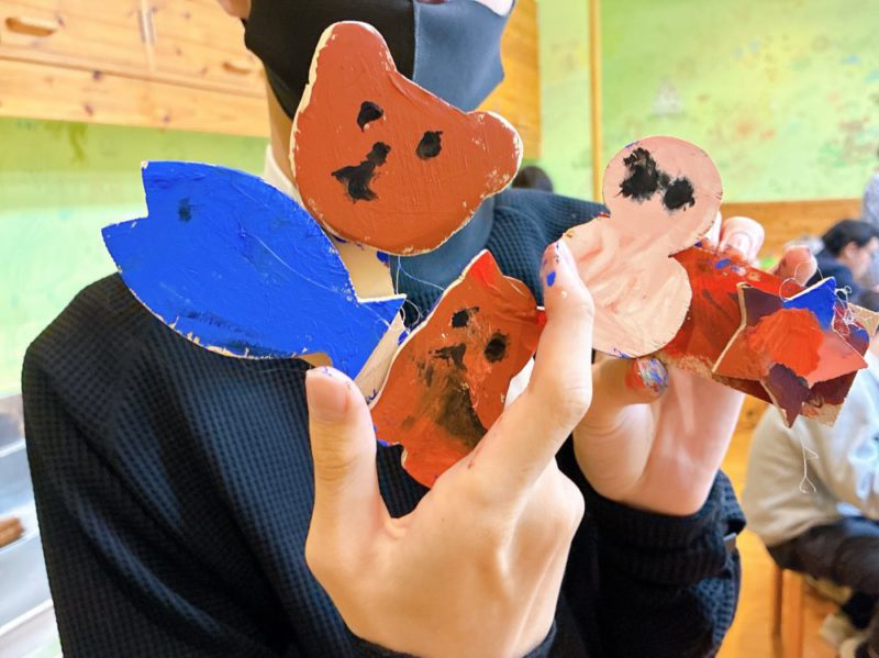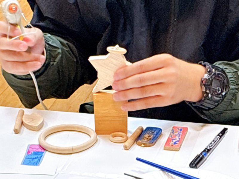 今回、予め生徒さんたちが学校で作ってきた札状の木片と、さまざまな形の木片とを用意しました。生徒さんは自分好みの材料を選び、制作に取りかかります。事前に用意した下絵をもとに木に描く人や、木材同士を繋げて形を探る人。木材に好きな色で着彩する人など、各自の直感とやりたい気持ちにそって作業を進めていきます。