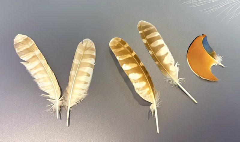 後半は、フリースペースに展示されている先生が収集した実物の羽根(羽毛)を皆で