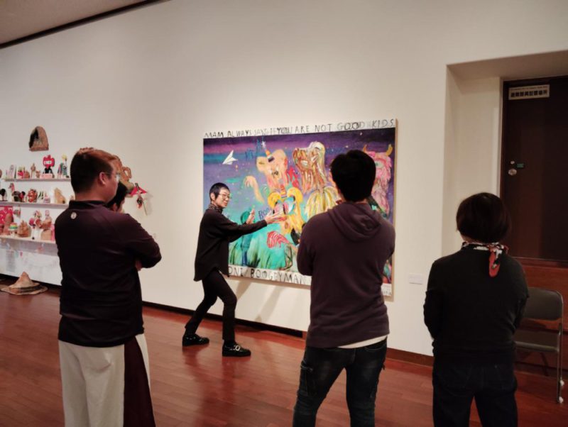 その後「しまうちみか-茫茫」展の会場に移動しいよいよ対話型鑑賞。最初は作品を1人でじっくり鑑賞、次にファシリテーターに促されながら、何が見えたか、どこを見てそう思ったかをそれぞれが語りあいました。最初はポツポツだった発言も、誰かの話を聞いて想像が膨らむと次々と増幅。作品を真ん中にして対話することで、直接的ではない安心感を持ちつつ、お互いに普段は見ていない顔も見えたのではないでしょうか。(6名)