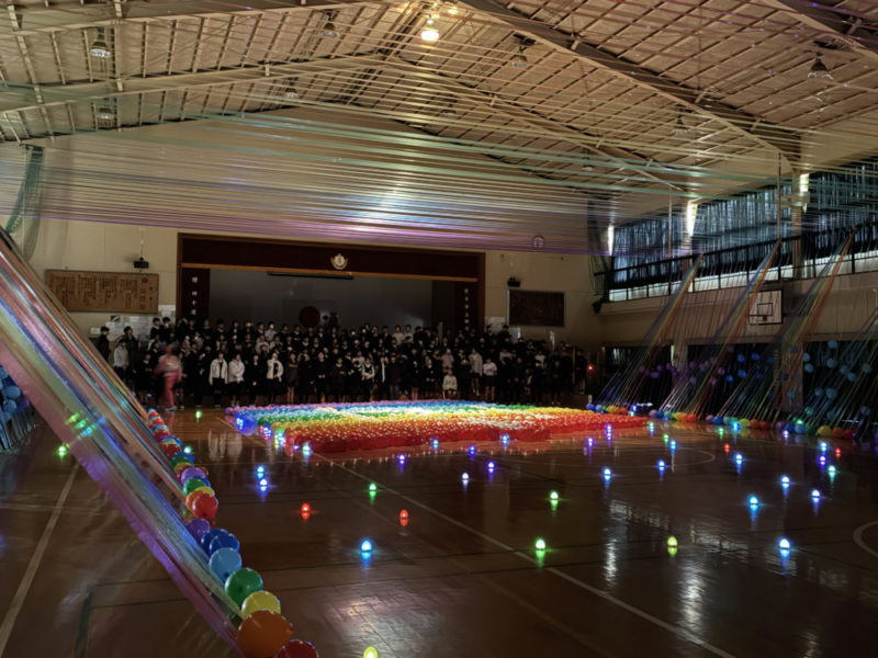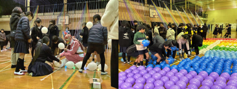 今回は、田迎南小学校体育館の広い空間を使って、6年生の皆さんと協力して虹の空間をつくりました。