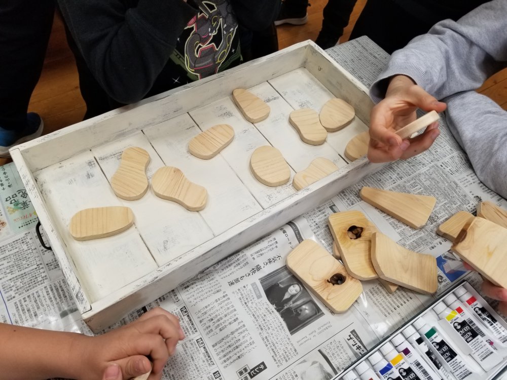 今回のテーマは「自分の中の神様」。コーダさんがさまざまなカタチをした木片を用意してくれました。中には穴のあいているものも。好きなカタチを選んだら、そこから想像をふくらませてペインティングを行います。子どもたちはさわったりにおいをかいだりして(ヒノキなのでほんのりいい香り!)、これがいいかな?あれがいいかな?と選んでいました。