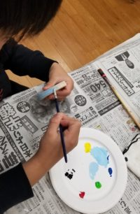 木片が決まったらいよいよペインティングです。コーダさんからは、好きな生き物でも架空の動物でも、「自分の中の神様」の姿かたちは自由でいいんだよとアドバイスがありました。はじめは緊張して鉛筆で下書きしたり、悩んでなかなか手が進まない様子も見られましたが、色を塗り始めると、楽しそうに制作を進めていました。自分の顔や飼い猫、お魚など具体的なモチーフの子もいれば、ちょっと抽象的な模様の子も。チューブ絵具の色が好きな子もいれば、混ぜて作った色が気に入った子もいます。裏と表で異なる色にしたり、側面まで丁寧に塗り上げるなど、みんな集中して一生懸命です。
