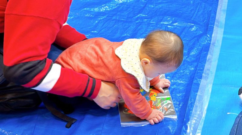 0歳のお子さんには、密封袋に画用紙と絵具を入れ、袋のままお子さんにペタペタ触ってもらう事で、