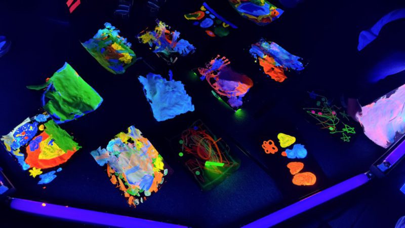 ブラックライトに照らされて、沢山のカラフルな「ゆめのお家」が浮かび上がりました。