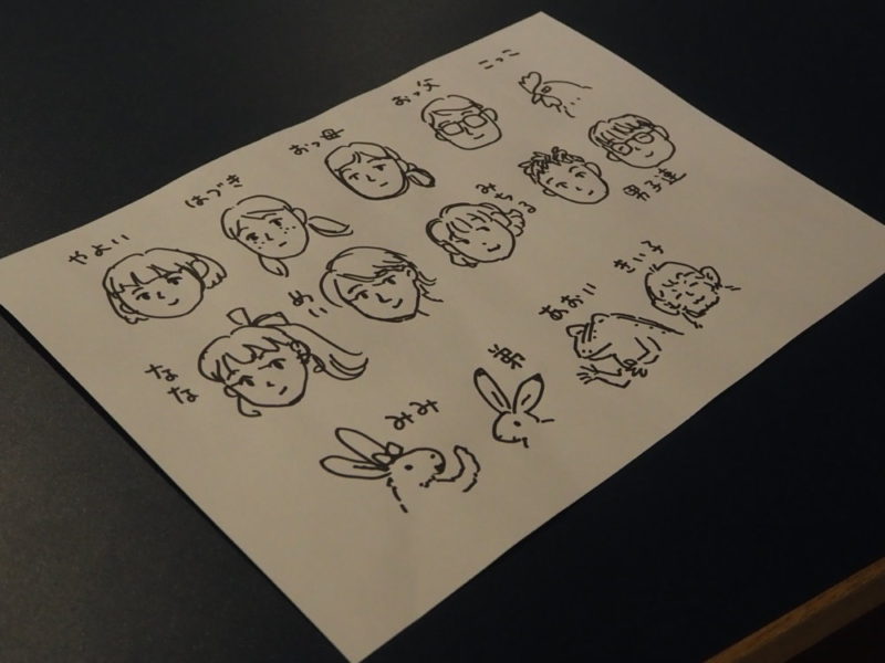 次に、ラクガキのラクガキをしてみました。「のびのびとまずはペンを動かすことで描きたいものが見つかってきますよ」というこうの先生の声がけのもと、イメージを膨らませてペンを動かしていました。こうの先生は「各壁に展示中の作品の登場人物紹介を描こうかしら」と試し描きをしていました。