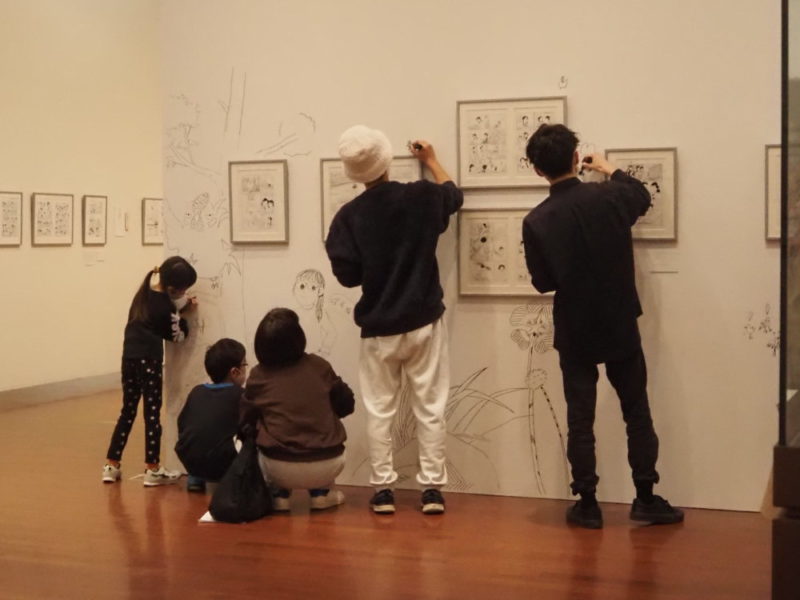 まずは今日ラクガキできる特別な壁を見学。展示中の原画から、こうの先生のペンづかいや、表情豊かなキャラクターをみて、この壁に自分が描きたいものを考えます。