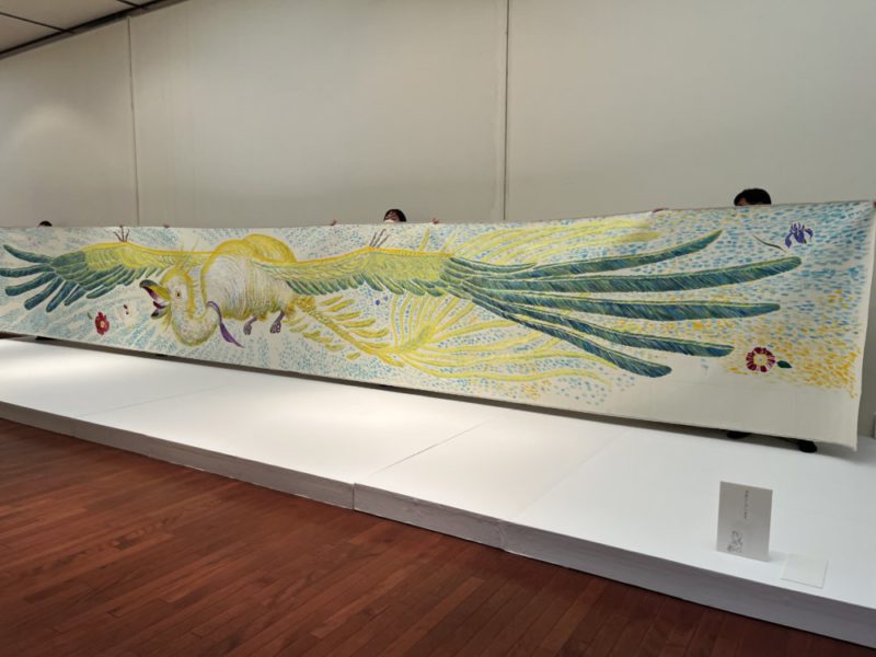 これまで巡回してきた金沢・福知山・佐倉の会場で描いてきた、10mにもおよぶ大きな鳥の作品。羽ばたく姿の周りには、これまで展覧会を開催してきた都市の花も描かれています。熊本ということで、今回は肥後椿を追加。