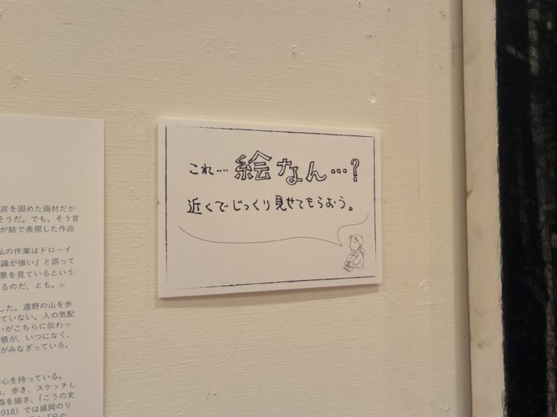 会場にはこうのさんの直筆ひとことコメントが掲示されている。チャコールで描かれた黒と白のリアルな本田健の絵画《山歩き・八月》(2000)には「これ…絵なん…? 近くでじっくり見せてもらおう。」とある。図録を見て作品を選んだので、写真にしか見えないと思ったらしい。そして、今日実際に見て、「写真をベースに描いたのでしょうね、すごいですね」と、こうのさんはその巨大な画面に、絵の匂いを嗅ぐほど近づいた。「これ、いつか、やってみたいですね」とも言った。