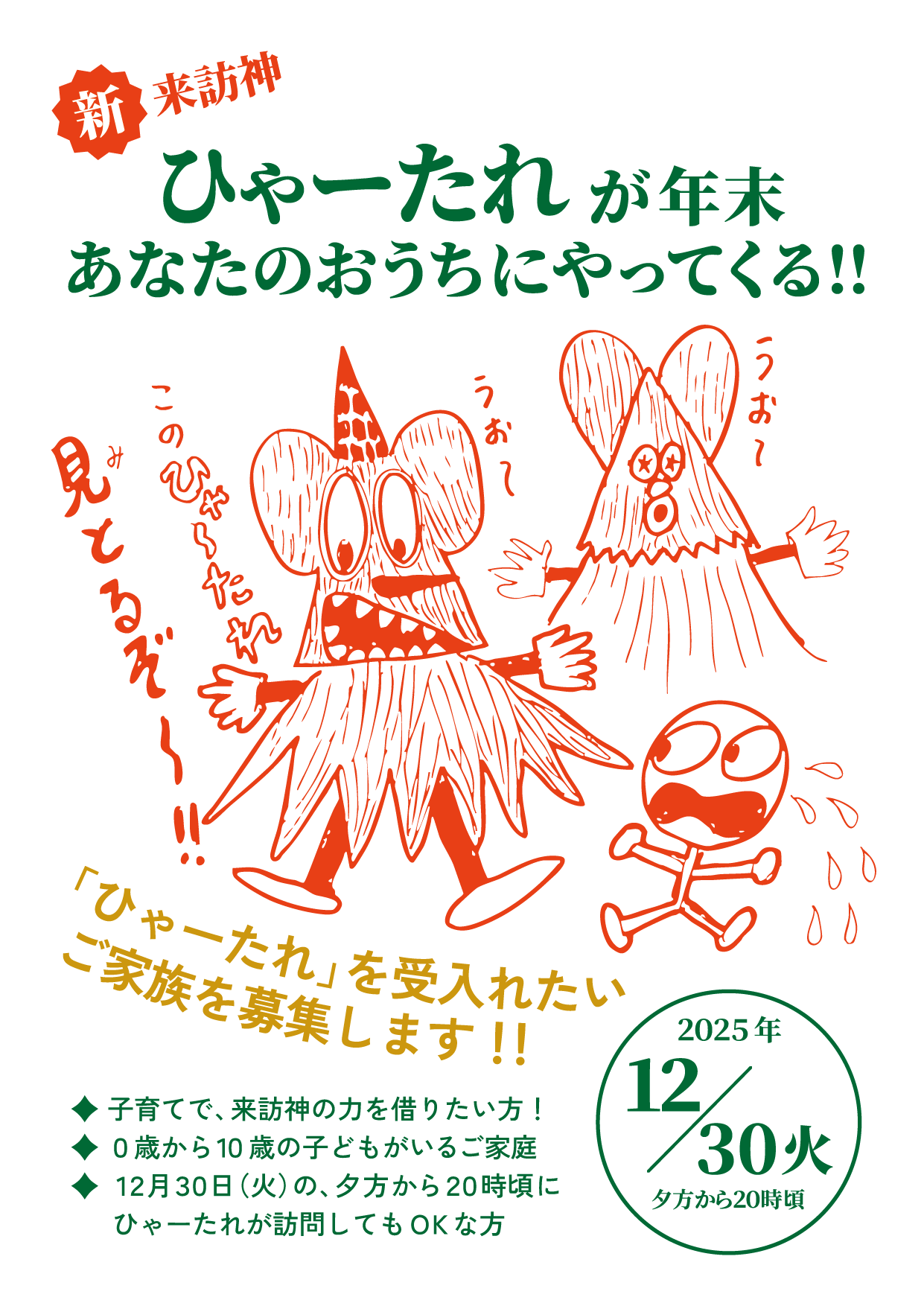 「子育てに来訪神の力を借りたい」というお気持ちを共有する、ひゃーたれを受け入れたい子育て中のご家族を募集します。