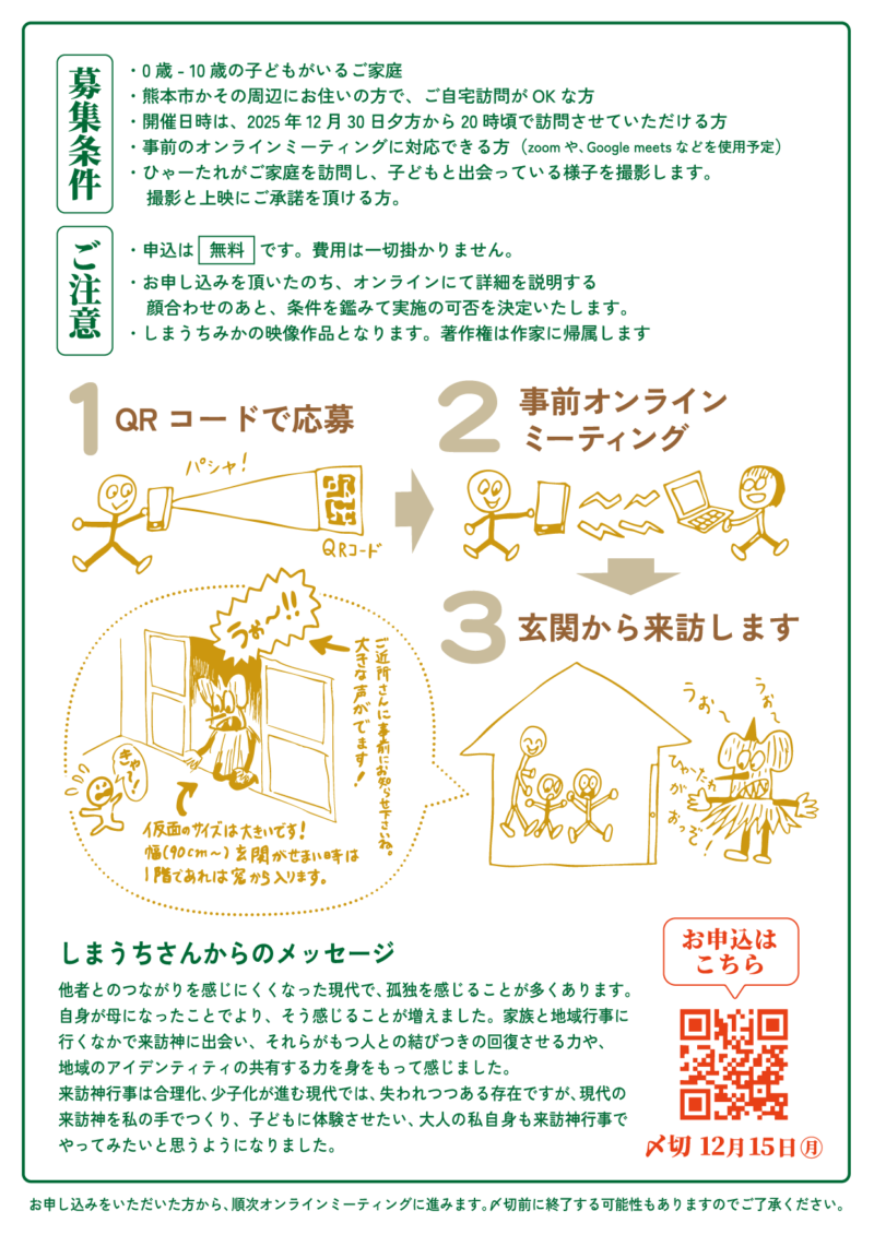 場所:熊本市やその周辺の0歳〜10歳程度の子どもがいるご家庭で、新・来訪神ひゃーたれが訪問してもOKな方のご自宅。