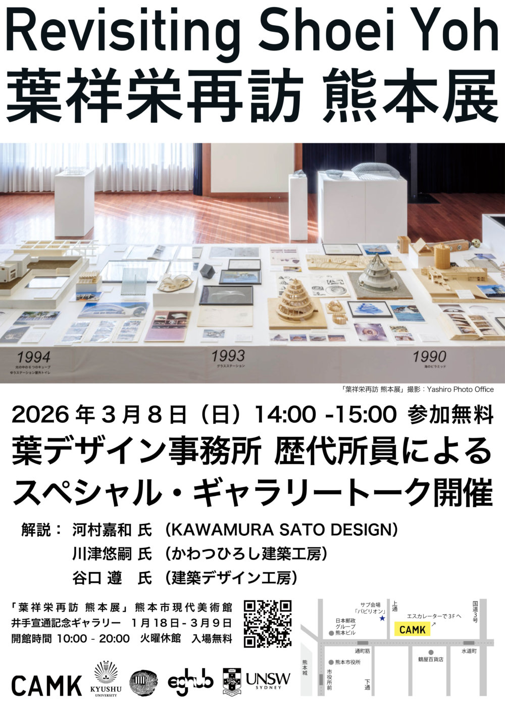 開催日 2026年3月8日(日) 時間14:00~15:00 場所井手宣通記念ギャラリー 料金・参加費無料、予約不要(*直接会場にお越しください) 定員先着30名程度 講師河村嘉和(KAWAMURA SATO DESIGN)、川津悠嗣(かわつひろし建築工房)、谷口遵(建築デザイン工房)司会:岩元真明(九州大学葉祥栄アーカイブ) 一覧へ戻る