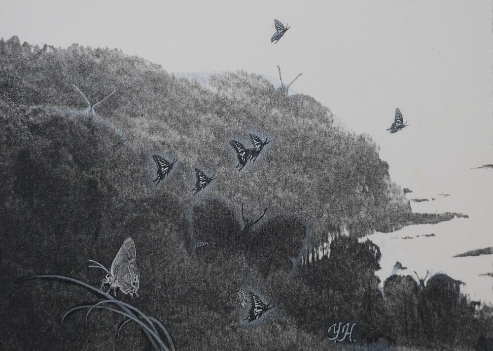 秀島は、逝去の直前まで、石牟礼道子との共作のシリーズ作品を制作しており、未完のままとなりました。石牟礼の詩のための小さな挿絵として描かれましたが、すべて、緑色の霧の空間に、主題を輪郭線なしでぼかして描くスフマート技法が試されています。