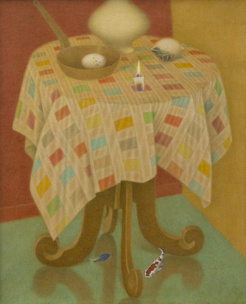 2000年代から逝去するまでの秀島は、色彩に満ちた、テンペラや油彩を重ねた混合画法による絵画作品を多く手がけました。また、カラー写真の上に直接細密描写で作画したり、写真をコラージュしたり、過去の作品に加筆するなど、様々な手法で実験的な作品を制作しました。この時期は、秀島の言葉によると「この世のものでもない、あの世のものでもない」を表現すること、例えば玉子などのオブジェが自然に透明な状態で存在するような状態を描くことと、変化(変身、変貌)の状態を描くことを好んでいた傾向があります。