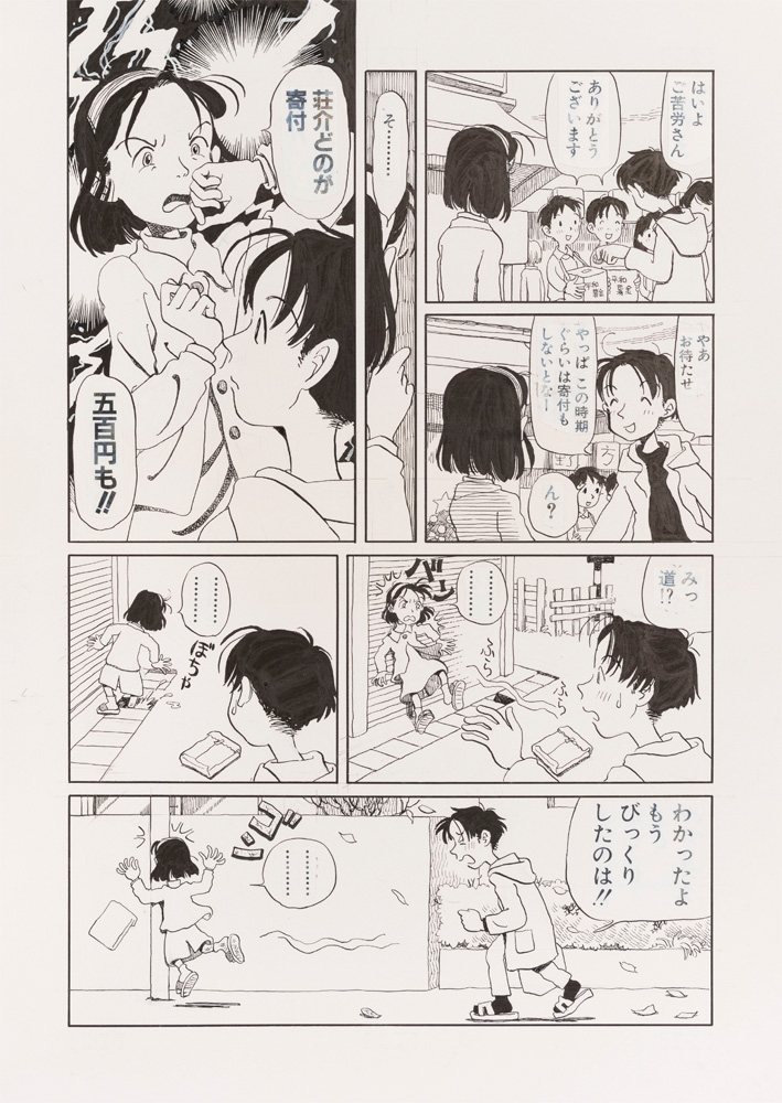 こうの漫画は、愛らしいタッチのまま、実に多彩です。どれをとっても、似た作品がありません。ひとつの作品を描くごとに、新しい、まだ見たことのない漫画表現の可能性へ向けて、一歩ずつ歩き続けているからです。こうの史代のいる場所から見ると、見慣れたはずの「漫画」という表現が、新鮮な姿に見えてきます。ほら、まだこんなに描くことがあるよ、というように。そう、決してこうの史代は、一つや二つの作品で、象徴できる漫画家ではないのです。一人の漫画家として、こうの史代が歩いてきたすべての道のりを、この展覧会ではたどります。