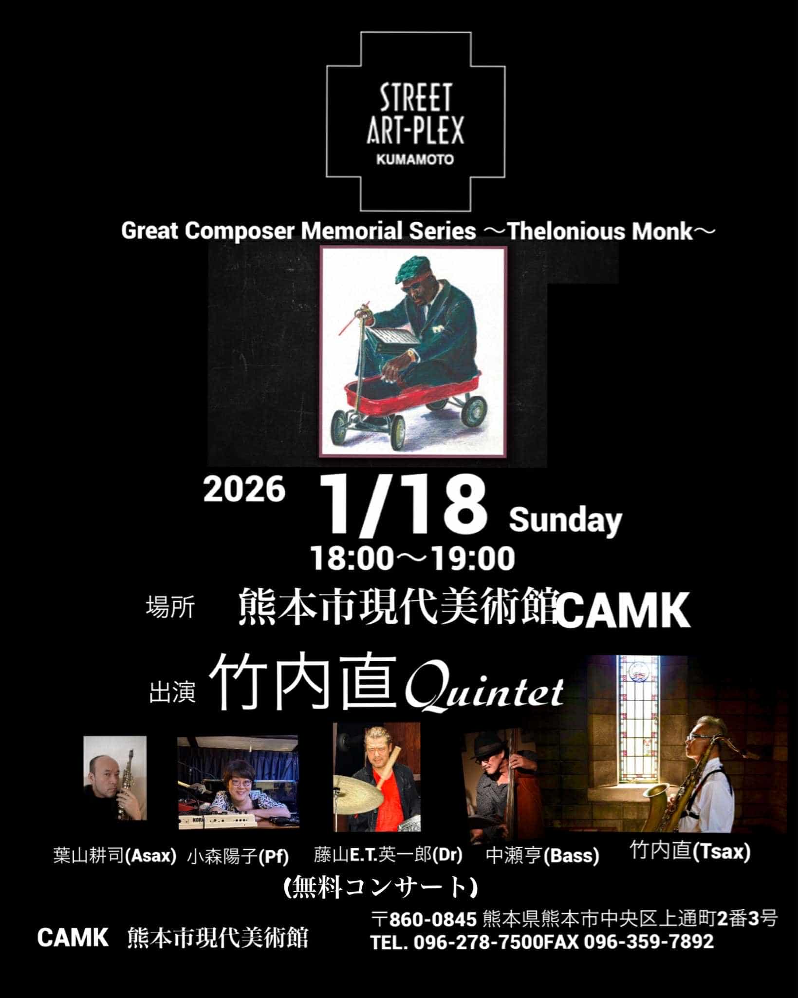 1940年~60代モダンジャズに革命的な変化をもたらしたピアノ奏者/作曲家/バンドリーダーセロニアスモンクの作品を集中的に取り上げ1時間程度のパブリックコンサートを開催いたします。皆様のご来場お待ちしております。
