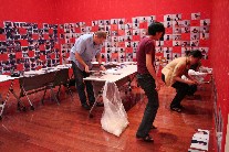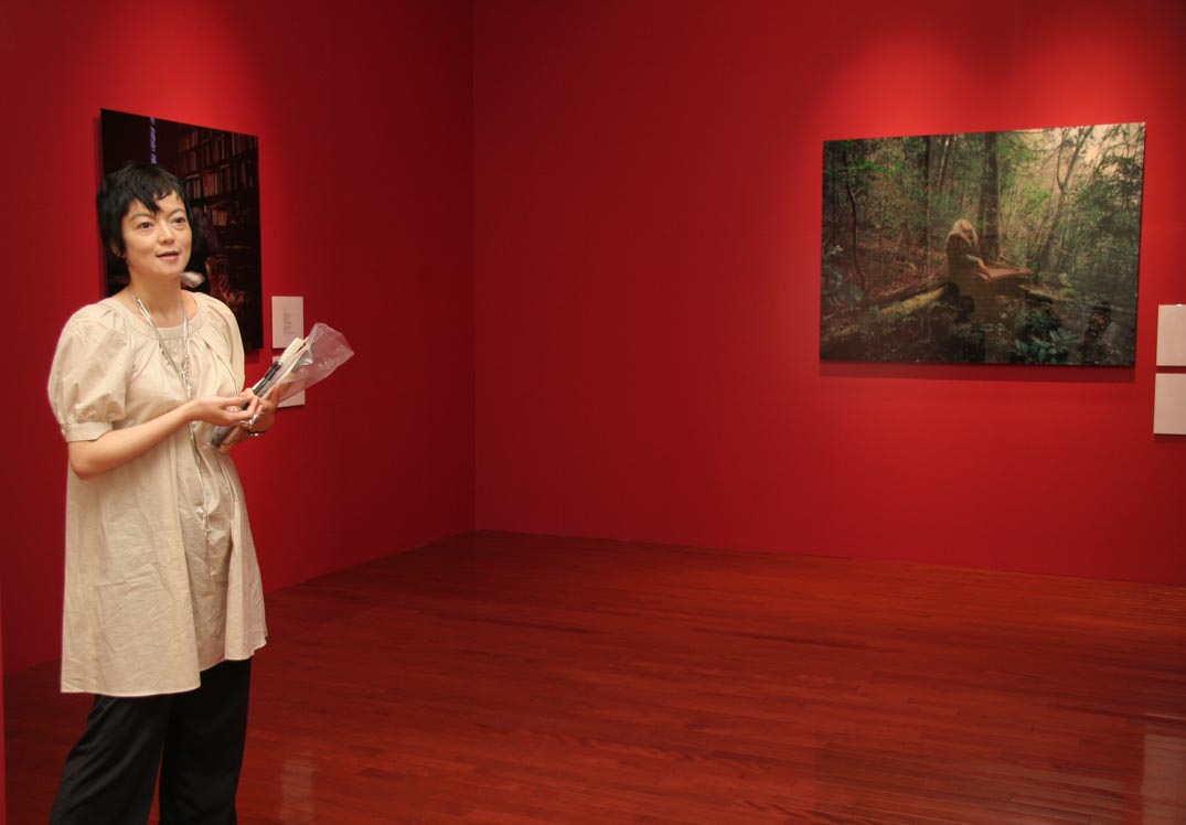 やなぎさんは、《My Granmothers》シリーズから2007年制作の新作3点を出品しています。 写真は、プレスの方々に作品を説明されるやなぎさん。 真っ赤な小部屋で、おばあちゃん達が皆さんとの出会いを心待ちにしています。