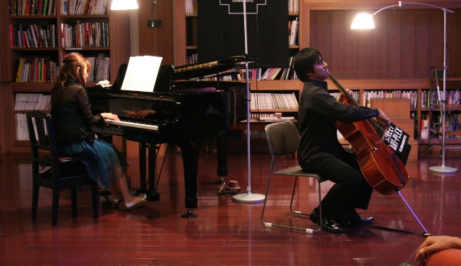 土曜日の夜の帳がおりるころ、灯りを落として幻想的な空間となったホーム・ギャラリーで奏でられる、アコーディオン、トロンボーン、コントラバス、ピアノによる絶妙なハーモニーにお客さまもうっとり。 くじゃくの音や遠い街の歌など、興味深いモチーフによる素敵な曲が夕暮れを彩りました。