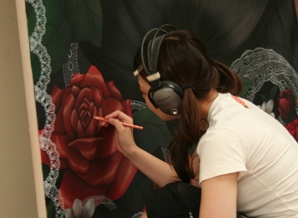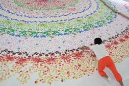「花・風景」展では、なんと13x20mという国内最大規模の作品に取り組んでいます。巨大空間に挑む大巻さん。 |