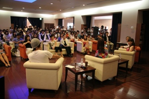 初日の今日は、出品作家である手塚愛子さん、齋藤芽生さんをゲストに迎えてのアーティスト・トークが開催されました。現在、日本の若手作家の中でも特に期待されているお二人ということで、たくさんの観客の方がいらっしゃいました。当館館長の桜井が聞き手となり始まったトークでは、制作に対する思いや本展に出品しての感想、今後の制作や展覧会についてなど作家自らの言葉で語られる秘話に夢中で聞き入るあっという間の1時間半でした。