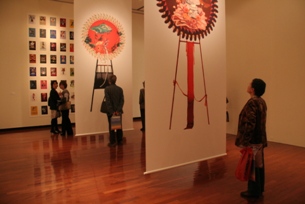 初日の今日は、出品作家である手塚愛子さん、齋藤芽生さんをゲストに迎えてのアーティスト・トークが開催されました。現在、日本の若手作家の中でも特に期待されているお二人ということで、たくさんの観客の方がいらっしゃいました。当館館長の桜井が聞き手となり始まったトークでは、制作に対する思いや本展に出品しての感想、今後の制作や展覧会についてなど作家自らの言葉で語られる秘話に夢中で聞き入るあっという間の1時間半でした。本展には、2009年に東京都庭園美術館で発表された手塚さんの《落ちる絵》、また、齋藤さんの花輪を描いたシリーズや《毒花図艦》などの作品が出品されています。 「祝祭と祈りのテキスタイル」という展覧会名に相応しい華やかさと緊張感を持ったこれらの作品にどうぞ会いにいらしてくださいね。