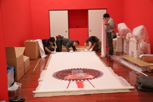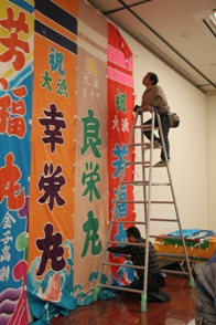 展覧会オープンを間近に控え、美術館では急ピッチで「祝祭と祈りのテキスタイル」展展示作業が進められています。入場してすぐにある大漁旗ブースや、続いての江戸の幟旗なども着々とその全貌を表し始めました。 また、出品作家である手塚愛子さん、齋藤芽生さん、ひびのこづえさんも来館し、後半の<アートとテキスタイル>の展示も完成に向かっています。会場内はどんどん祝祭のムードが盛り上がっておりオープンするのがとても楽しみです! ![]() ![]()
