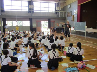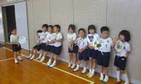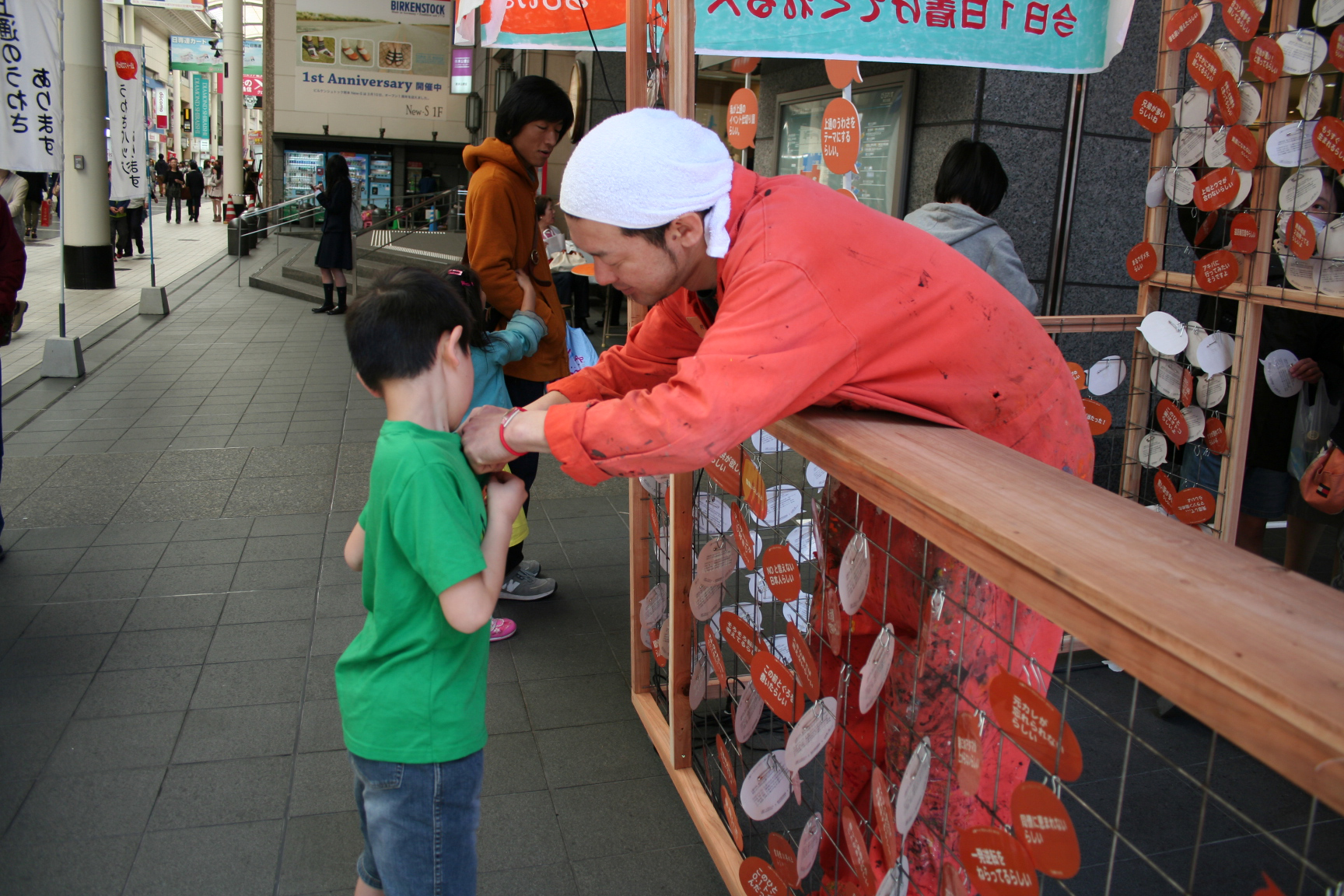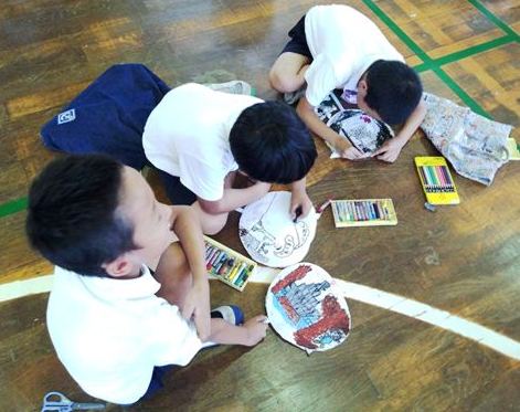 ![]() 今日は、“くまもとのひみつ”を描いたオリジナルうちわ作りの3日目、壺川小学校の皆さんにご協力いただきました。 青森県八戸から訪れている山本耕一郎さん。始めに、どこから来たでしょう(?)というクイズにみんな元気よく答えてくれてとても盛り上がりました。熊本って何があるの?好きな場所や食べ物は?など、問いかけながら、熊本について知っていることをたくさん描いてみんなに教えよう!というところから、うちわ作りが始まりました。 うちわ作りに入ると、子ども達は、クレヨンや色鉛筆を使って、おいしいお水や近所の公園…身近な熊本について描いてくれました。そして出来上がったうちわを手に、自分たちが描いたものを一生懸命教えてくれました |