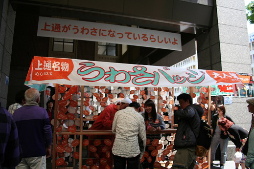 うわさバッジがついた屋台や、うわさののぼり、うわさの吹き出しテーブルが登場し、会場はメインカラーのオレンジ一色でした♪会場内の一つ一つが山本さん、美術館ボランティアスタッフ、上通り商店街の方の手作りで、とても見応えがありました。そして、晴天の中スタートした『上通出逢い景』には、子どもから大人まで、たくさんの方が参加してくれて大賑わいでした★ 一枚一枚書かれている上通のうわさに、くすっと笑ったり、首をかしげてみたり、大きくうなづいたり、色々な笑顔が見られました。その笑顔と一緒になったバッジをカメラに収め、柱や壁に貼り出しました 400枚以上あったうわさバッジは、全て皆さんの胸について旅立って行きました♪ ![]() ![]() 次のうわさプロジェクトは、5月4日(土)12:00〜美術館内ホームギャラリーにて『うわさの神社』が登場します!是非お気軽に足をお運びください。 |