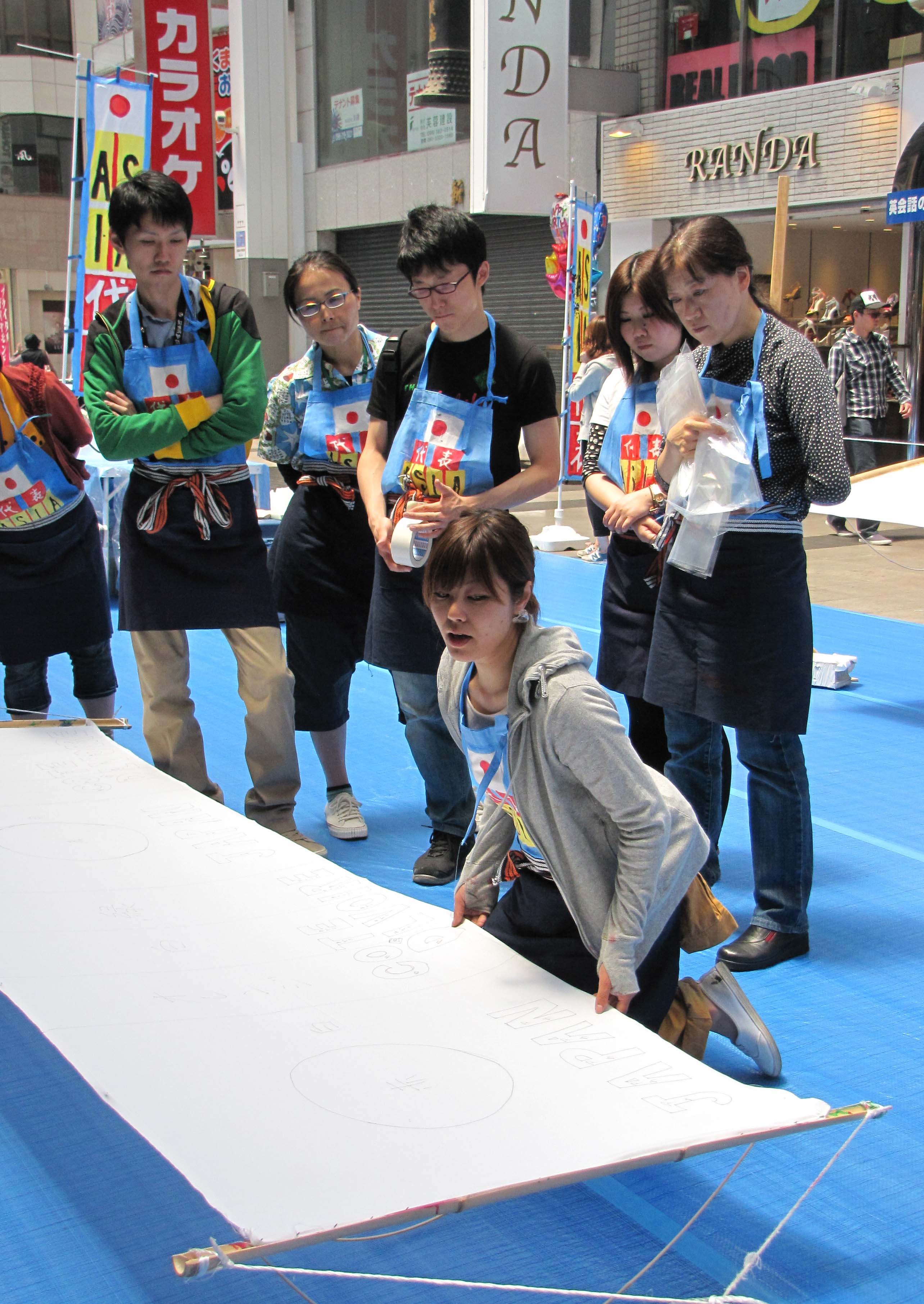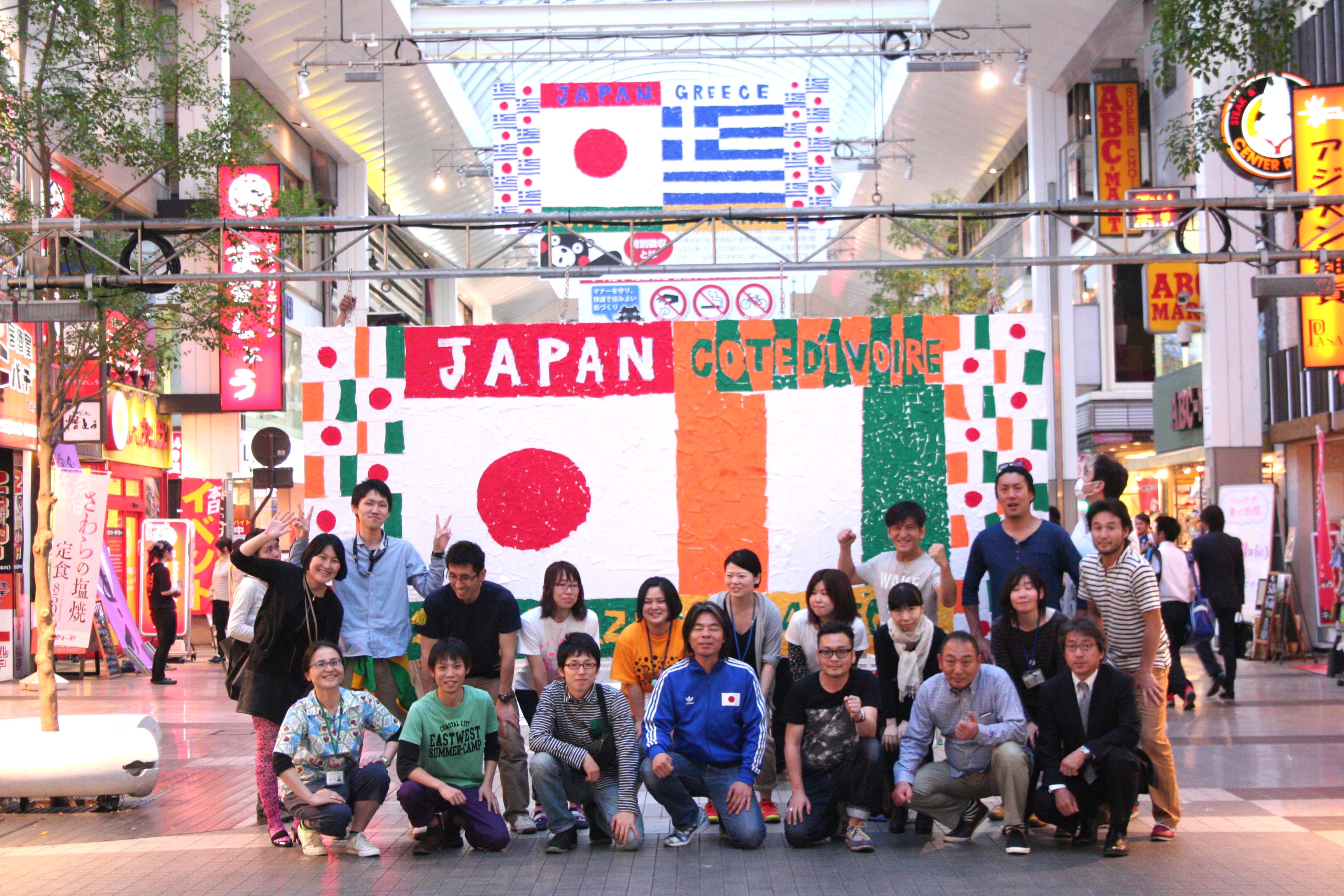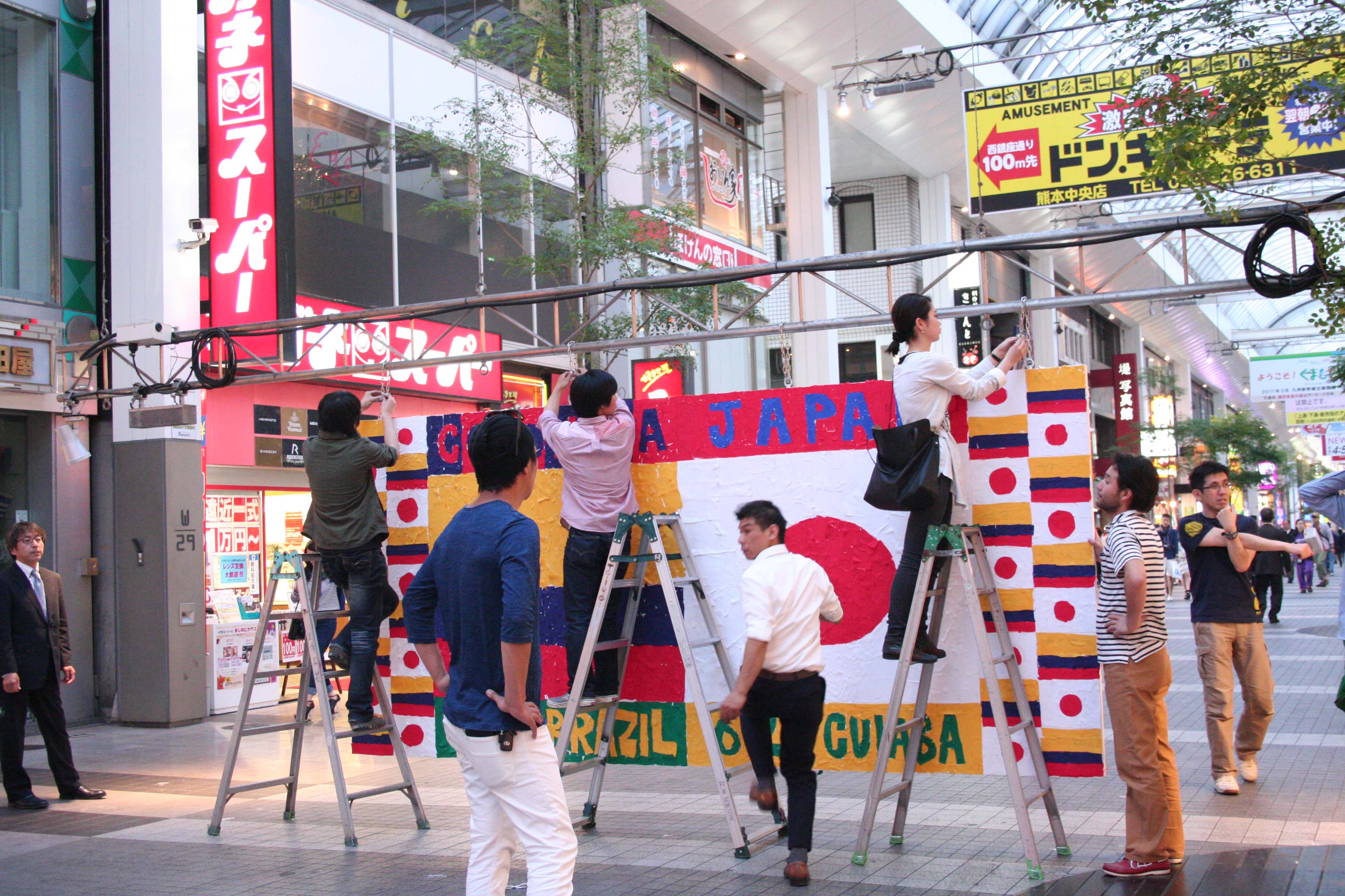 サッカーの試合での対戦国二つのナショナルフラッグを一つにして作られるマッチフラッグ。 アーティストの日比野克彦さん発案のもとに熊本で始まったこのプロジェクトも、今や全国に広がり、今年はW杯ブラジル大会のために各地で制作が行われています。 今回は従来からの布を貼っていく手法に加えて、新たに「染め」によるフラッグ制作が行われることになりました。 染めの指導のため、太宰府のワークショップチームも応援にかけつけてくれました。 ![]() 染めの手順について指導を受けるスタッフたち。 ![]() ![]() 商店街の真ん中で布を染める集団に、道ゆく人たちも物珍しそうな顔。 そんな人たちに声をかけて、一緒にフラッグ制作を手伝ってもらいます。 もちろん子どもも大歓迎。新聞のエプロンをつけて、ぬりぬりしてもらいました。 ![]() 休日ということもあって人通りも多く、「染め」「貼り」ともにたくさんの人たちが参加してくれました。 染めで作ったフラッグはこれから縫い合わされてさらに巨大なマッチフラッグとなり、実際にブラジルに持って行って応援に使用されます。 ![]() また貼りの方のフラッグは、スタッフとまちの人々が見守る中、下通アーケード内に掲げられました。 みんなで汗をかきながら丸一日かけて作ったフラッグが上がっていくのを見ていると、何かじーんと来るものがありました…。 ![]() さあ対戦相手に思いをはせつつ、試合当日に向けて盛り上がっていきましょう!!