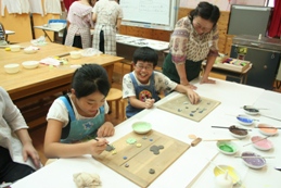 ![]() 「ボタンを作ろう」ワークショップを開催しました。今回は小学5年生から大人まで、15名の方が参加されました。ボタンは、クッキーの型や、ペンのキャップなどで型どりをした後、陶芸用の絵具で色をつけました。植物、乗り物、虫や動物、野菜のボタンなどいろんな形と色のボタンが完成。アクセサリーやお洋服にも使える、かわいいオリジナルのボタンができました! |